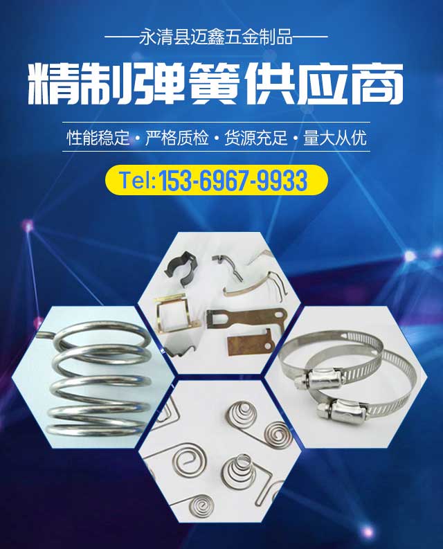 永清县迈鑫五金制品有限公司是一家专业生产销售各类弹簧的实体厂家,从事该行业10多年,工厂位于河北省廊坊市永清南八里庄工业园区。专业加工生产各种渔具弹簧、拉伸弹簧、压缩弹簧、扭转弹簧、异形弹簧、模具弹簧、锁具弹簧、涡卷弹簧、线型簧、碟簧、高铁螺旋黄等。原材料均由国内大公司提供先进技术设计的电脑仪器检验质量,确保其品质满足客户要求。