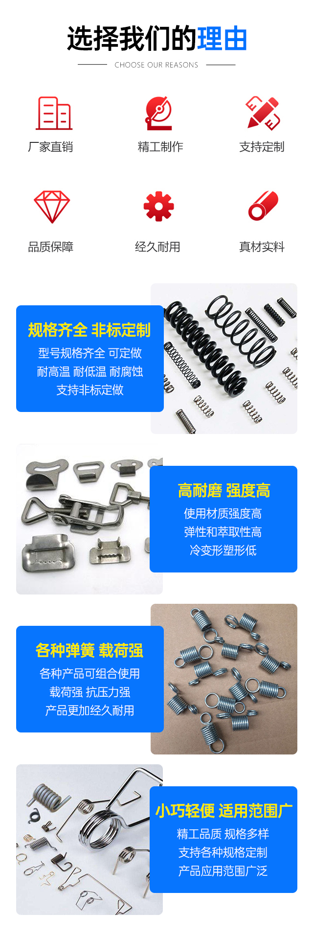 我们在聘请有多年生产弹簧经验的高级技师为您设计和定做弹簧的同时,还拥有多种检测设备来辅助弹簧制作。公司生产的弹簧规格为:圆丝、扁丝、异性弹簧,各种进口、国产不锈钢弹簧,还可根据不同客户需求定制相应产品。